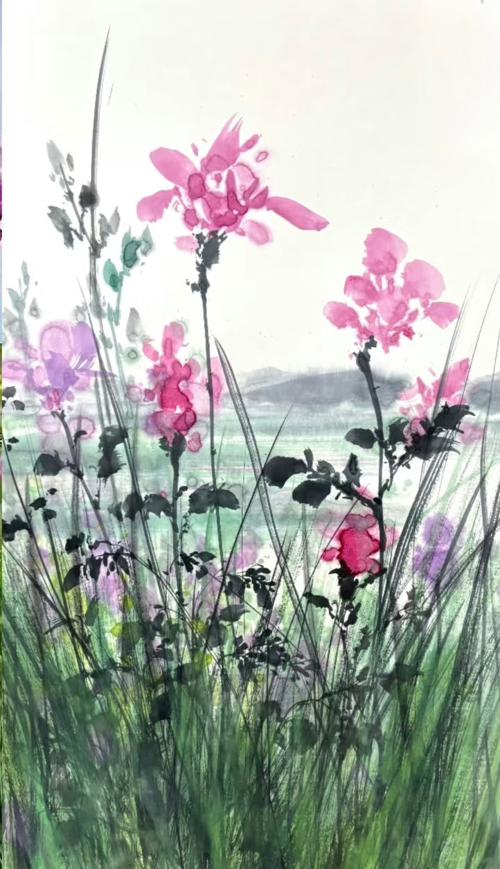Paint wildflowers, mountains, birds, reeds, water, and Taihu stones