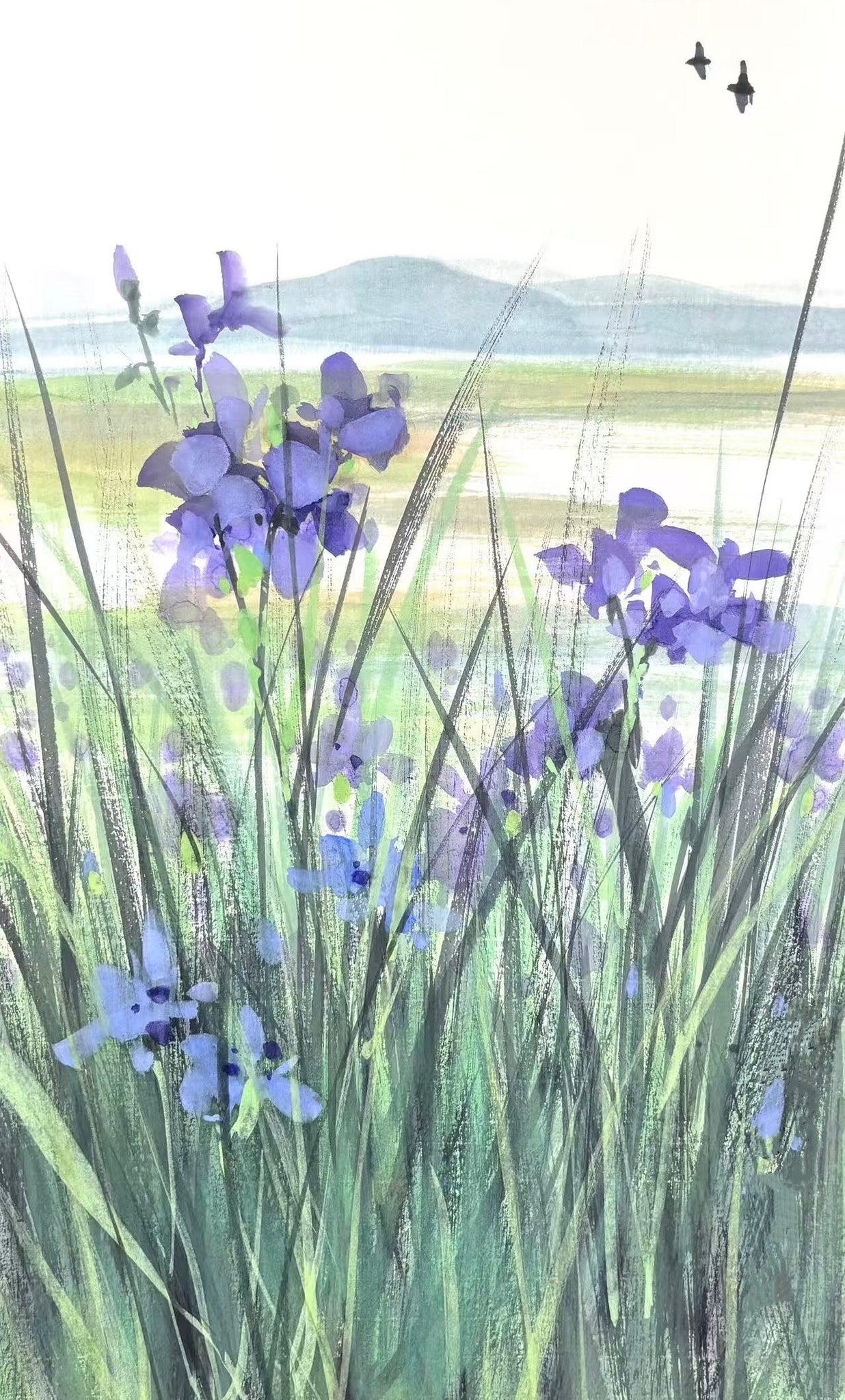 Paint wildflowers, mountains, birds, reeds, water, and Taihu stones