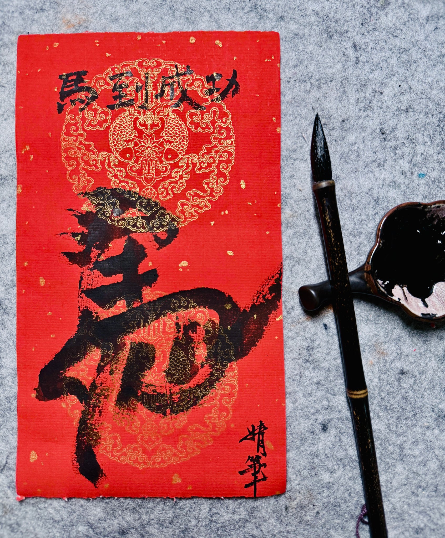 Your final ink painting artwork will be created on pre-mounted xuan (rice) paper, while the printing artwork will be on red Xuan paper, ready to frame or display at home.